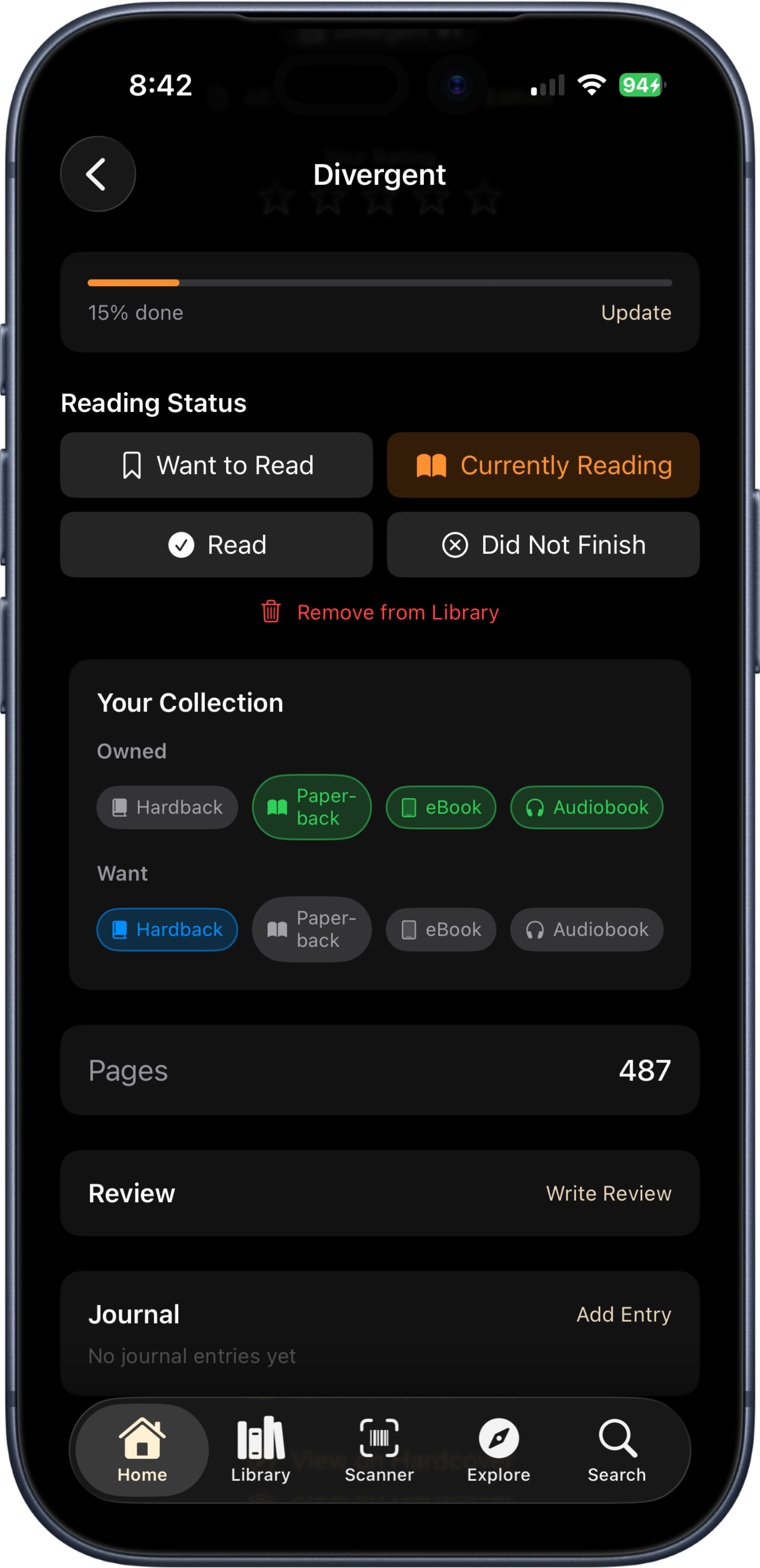 Hardback, paperback, eBook, and audiobook stay separate, so one title can reflect what you actually own instead of one vague status.