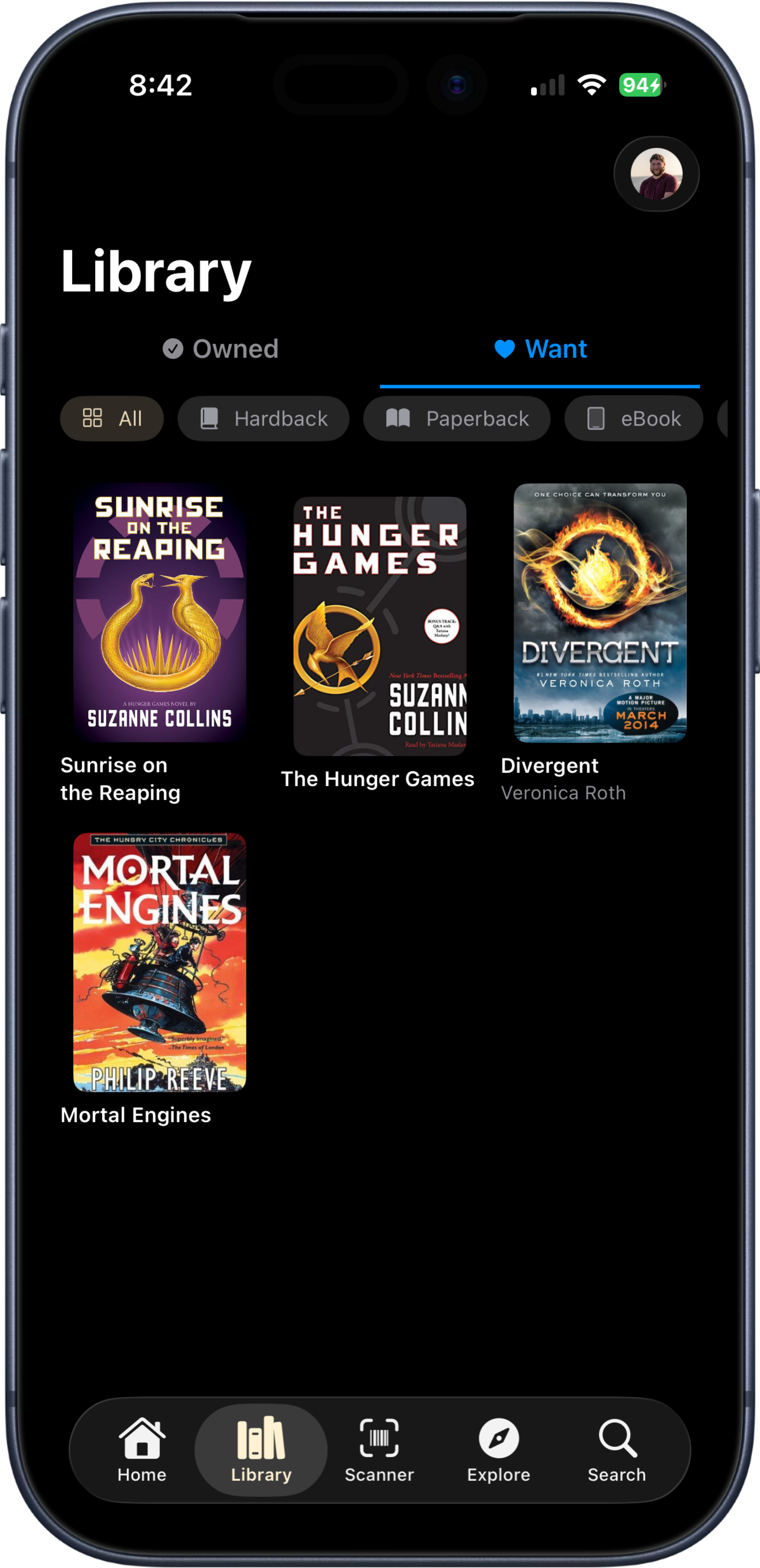 Once books are in, the library stays easy to scan. Owned and Want stay visible, and the collection still makes sense at a glance.